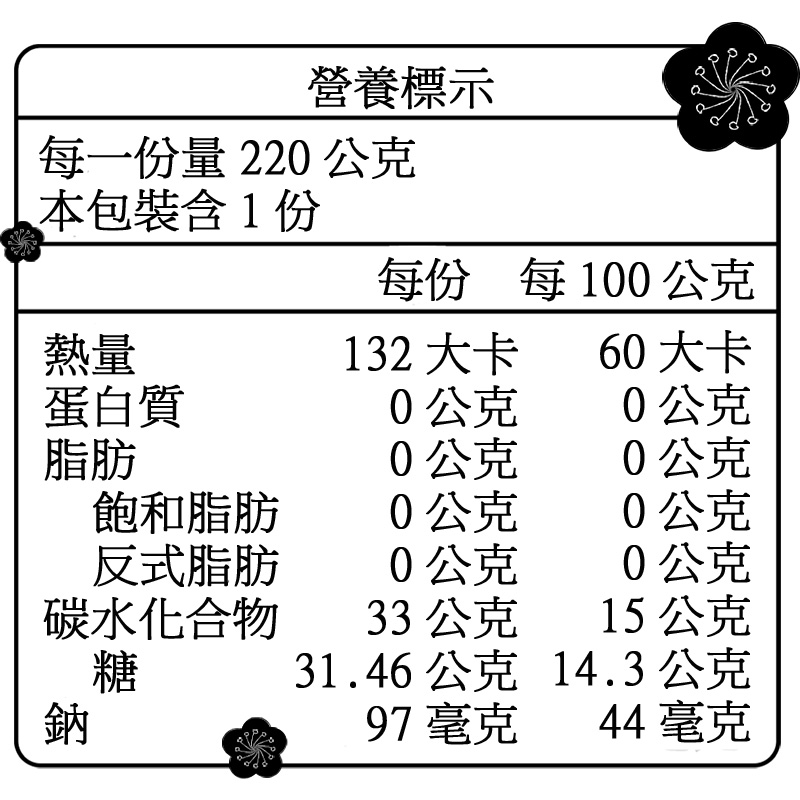成份:水、酸梅汁、砂糖、調味劑(檸檬酸鉀、檸檬酸鈉、檸檬酸)、鹿角菜膠、洋菜膠、刺槐豆膠、蒟蒻粉